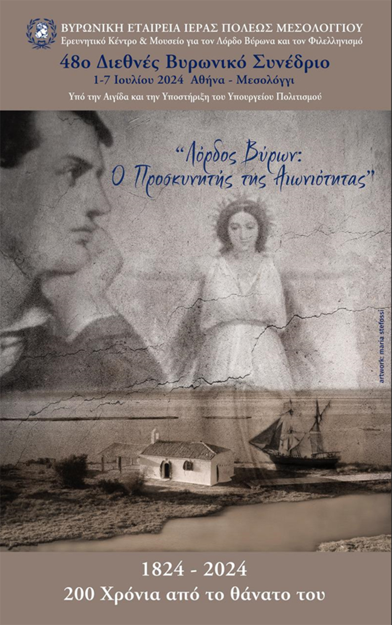 Διακόσια χρόνια συμπληρώνονται φέτος από τον θάνατο του Λόρδου Βύρωνα στο Μεσολόγγι, και η Διεθνής Ένωση Βυρωνικών Εταιρειών τιμά την επέτειο με ένα διεθνές συνέδριό της στην Ελλάδα. Οι εργασίες του συνεδρίου θα πραγματοποιηθούν στην Αθήνα και στο Μεσολόγγι από τη Δευτέρα 1 Ιουλίου μέχρι την Κυριακή 7 Ιουλίου, με κεντρικό θέμα «Μπάιρον: Ο Προσκυνητής της Αιωνιότητας».
