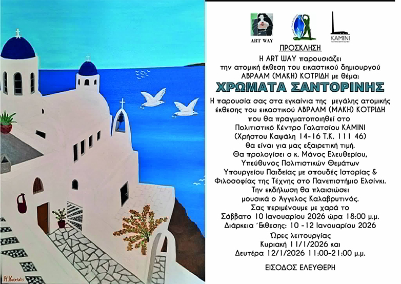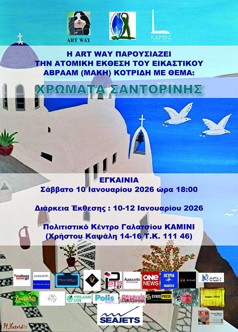 Τα εγκαίνια της έκθεσης με θέμα «Χρώματα Σαντορίνης», θα πραγματοποιηθούν το Σάββατο 10 Ιανουαρίου 2026 στις 18:00, στο Πολιτιστικό Κέντρο «Καμίνι» του Δήμου Γαλατσίου.