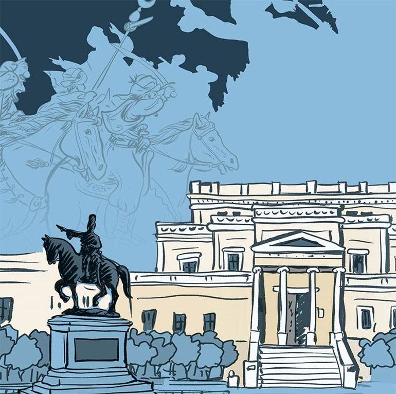 Η έκθεσή μας διατρέχει γραμμικά την Ιστορία της Ελλάδας, από τη σύσταση του ελληνικού κράτους, μέχρι σήμερα, όπως αυτή αποτυπώνεται στην εγχώρια παραγωγή, παρακολουθώντας βιογραφίες επιφανών Ελλήνων, ιστορικά γεγονότα-σταθμούς, αλλά και απλές, καθημερινές στιγμές των κατοίκων της χώρας μας, μέσα στον χρόνο και τον χώρο.