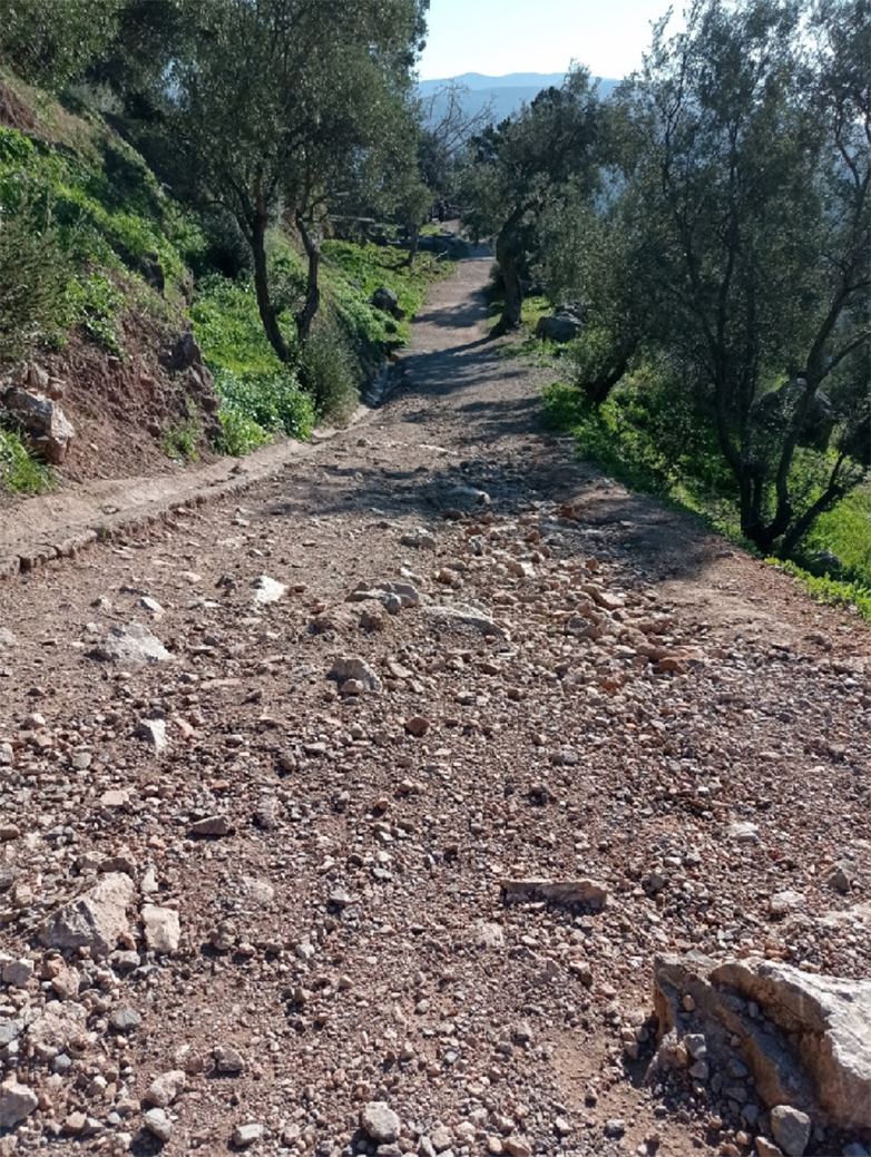 Το νερό εισέρχεται στον δρόμο δημιουργώντας νεροσυρμές, ενώ τμήματα των λίθινων επενδύσεων των πρανών παρουσιάζουν σημειακές φθορές.
