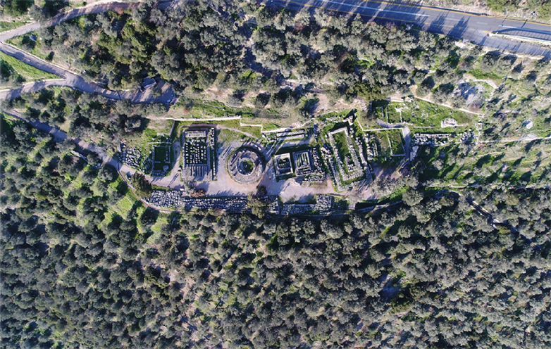 Άποψη των αρχαιολογικών χώρων του Αρχαίου Γυμνασίου και του Ναού της Αθηνάς Προναίας από ψηλά