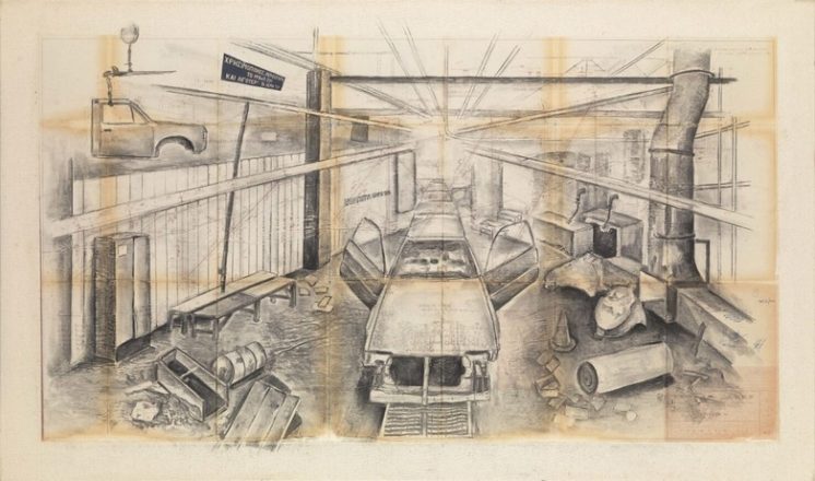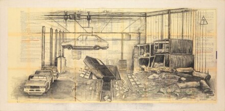 Στα πολύπλευρα και πολυεπίπεδα εικαστικά σύνολα που παρουσιάζει, καμβάδες της γίνονται τα παλιά σχέδια συναρμολόγησης (blue prints) που χρησιμοποιούνταν για την παραγωγή αυτοκινήτων στο εμβληματικό εργοστάσιο της ΤΕΟΚΑΡ ΑΒΕΕ (1980-1995), της οικογένειας Θεοχαράκη.