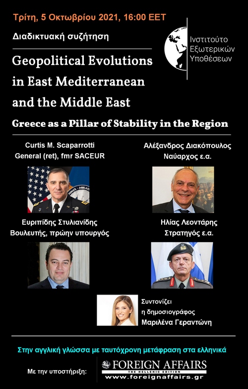 Δημόσια διαδικτυακή συζήτηση με θέμα «Geopolitical evolutions in eastern Mediterranean and the broader Middle East – The role of Greece as a pillar of stability in the region» διοργανώνει το Ινστιτούτο Εξωτερικών Υποθέσεων, την Τρίτη, 5 Οκτωβρίου 2021.