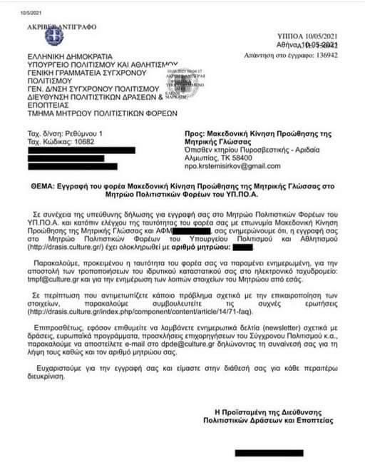Το Υπουργείο Πολιτισμού και Αθλητισμού ενημερώνει πως η Αστική Μη Κερδοσκοπική Εταιρεία «Μακεδονική Κίνηση Προώθησης της Μητρικής Γλώσσας» με αριθμό καταχώρησης 5/2018 στα βιβλία εταιρειών του Πρωτοδικείου Έδεσσας, έχει διαγραφεί από το Μητρώο Πολιτιστικών Φορέων του ΥΠ.ΠΟ.Α., καθώς διαπιστώθηκε ότι ο εμφανιζόμενος ως διαχειριστής και νόμιμος εκπρόσωπος της εν λόγω ΑΜΚΕ φέρεται να έχει απασχολήσει επανειλημμένως την ελληνική δικαιοσύνη, γεγονός που εγείρει σοβαρά ερωτήματα ως προς τη δυνατότητα συμπερίληψής του στο Μητρώο Πολιτιστικών Φορέων του ΥΠ.ΠΟ.Α.