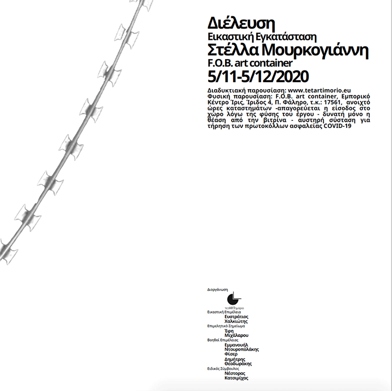 Η α.μ.κ.ε. τετARTημόριο από την Πέμπτη 5 Νοεμβρίου 2020 στον χώρο F.O.B. – Art Container, Ίριδος 4 στο Παλαιό Φάληρο παρουσιάζει την εικαστική εγκατάσταση της Στέλλας Μουρκογιάννη από λεπιδοφόρο συρματόπλεγμα με τίτλο «Διέλευση».