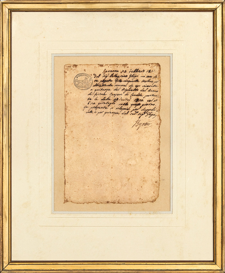 Μία απόδειξη είσπραξης χρημάτων στα ιταλικά με την υπογραφή του μεγάλου φιλέλληνα Λόρδου Βύρωνα από τον τραπεζίτη του στη Ραβέννα, Pellegrino Ghigi (23 Φεβρουαρίου 1821).