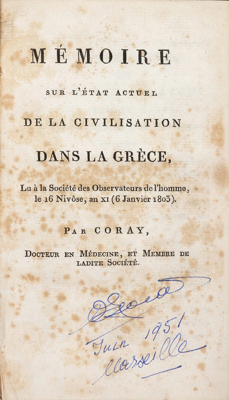 Η περιορισμένη σε 300 αντίτυπα δεύτερη έκδοση του Υπομνήματος του Αδαμάντιου Κοραή στα γαλλικά (Παρίσι 1818), με το οποίο ο πρωτεργάτης του Νεοελληνικού Διαφωτισμού παρουσίασε σε ένα ξένο ακροατήριο, στην Eταιρεία των Aνθρωποτηρητών του Παρισιού, τα πρώτα σημάδια εθνικής αφύπνισης του ελληνικού λαού.
