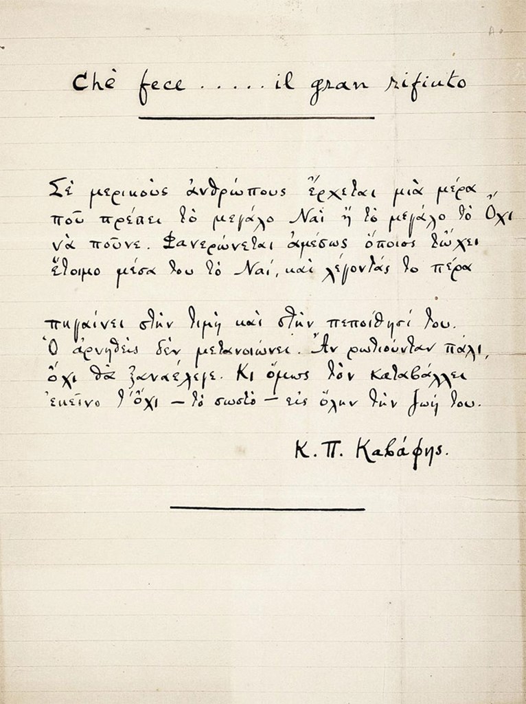 Ξεχωρίζουν το χειρόγραφο ποίημα «Che fece … … il gran rifiuto» του Κων. Καβάφη και 22 αυτόγραφες επιστολές του Οδυσσέα Ελύτη