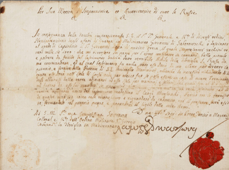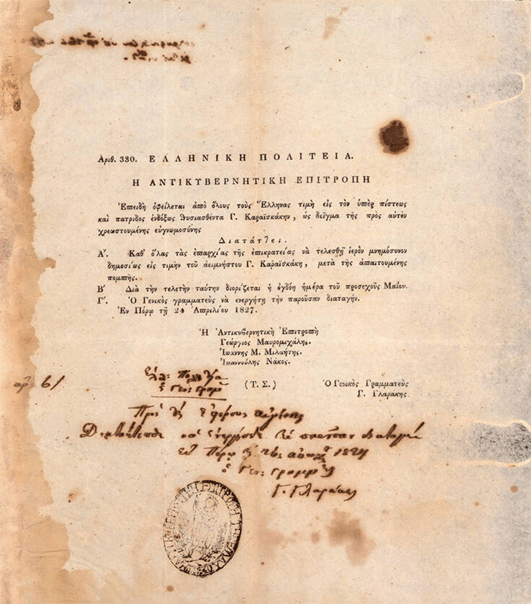 Στην κατηγορία ιστορικών χειρογράφων, περίοπτη θέση κατέχουν, μεταξύ άλλων, τα ακόλουθα: Ένα από τα ελάχιστα γνωστά έγγραφα με την υπογραφή του Λάμπρου Κατσώνη, του περίφημου ήρωα του απελευθερωτικού κινήματος του 1787 καθώς και η έντυπη διαταγή της τριμελούς επιτροπής που κυβερνούσε την Ελλάδα πριν την έλευση του Καποδίστρια, για την τέλεση σε όλη την επικράτεια μνημόσυνου του «υπέρ πίστεως και πατρίδος ενδόξως θυσιασθέντα» Γεωργίου Καραϊσκάκη, ως ένα ελάχιστο δείγμα ευγνωμοσύνης (24 Απριλίου 1827).