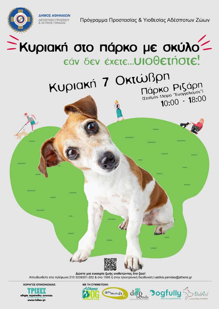 Αν θέλετε να μάθετε περισσότερα για την υπεύθυνη υιοθεσία, σας περιμένουμε την Κυριακή 7 Οκτωβρίου στο Πάρκο Ριζάρη (Σταθμός Μετρό «Ευαγγελισμός»), από τις 10.00 έως τις 18.00, για μια βόλτα στο πάρκο με σκύλο… ή χωρίς! Η εκδήλωση «Κυριακή στο Πάρκο με σκύλο» που διοργανώνει ο Δήμος Αθηναίων είναι αφιερωμένη στους τετράποδους φίλους μας, αδέσποτους και δεσποζόμενους.