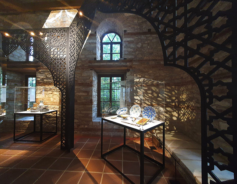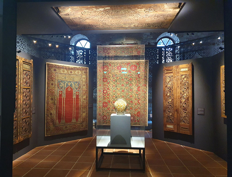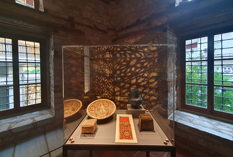 Καθώς ο επισκέπτης περνά το κατώφλι του τζαμιού, η δροσιά της πέτρας, το φιλτραρισμένο φως από τα παράθυρα με τα τοξωτά πλαίσια και η λιτή αλλά επιβλητική αρχιτεκτονική, δημιουργούν μια αίσθηση ιερής σιωπής. Σε αυτό το περιβάλλον, τα περίπου 60 αντικείμενα της έκθεσης δεν εκτίθενται απλώς, αλλά ταξιδεύουν τον επισκέπτη στην πλούσια ιστορία της ισλαμικής τέχνης σε πολλές χώρες του αραβικού κόσμου, και όχι μόνο.