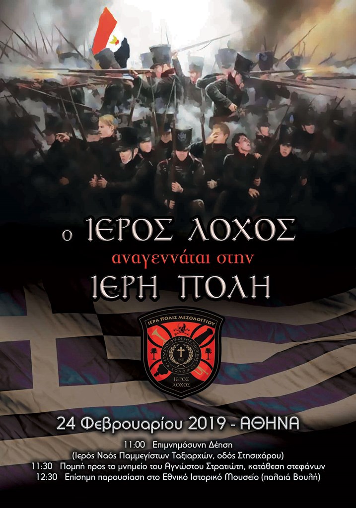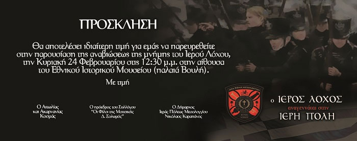 Την Κυριακή 24 Φεβρουαρίου στις 12:30 στην αίθουσα του Εθνικού Ιστορικού Μουσείου (Παλαιά Βουλή) θα παρουσιασθεί επισήμως, το εγχείρημα του Συλλόγου Φίλοι της Μουσικής «Διονύσιος Σολωμός», «Ο Ιερός Λόχος αναγεννάται στην Ιερή πόλη» με κεντρικό ομιλητή τον κ Γ. Σούρλα, τ. Αντιπρόεδρο της Βουλής και παρουσιαστή τον κ. Ν. Βαφειάδη.