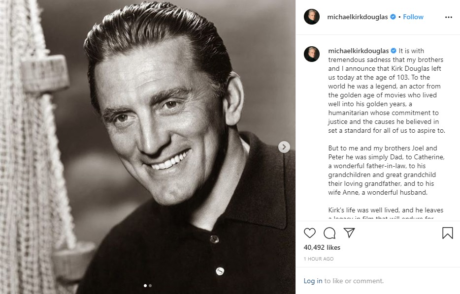«Με τεράστια λύπη μας, τα αδέρφια μου και εγώ, γνωστοποιούμε ότι ο Κερκ Ντάγκλας μάς άφησε σήμερα σε ηλικία 103 ετών» έγραψε χαρακτηριστικά.