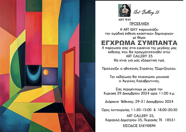 Σας περιμένουμε στα εγκαίνια της έκθεσης μας με θέμα «Έγχρωμα Σύμπαντα» Κυριακή 29-12-2024 και ώρα 11:00 π.μ. η οποία θα πραγματοποιηθεί στην ΑRT GALLERY 35 ( Καραολή Δημητρίου 35, Πειραιάς)