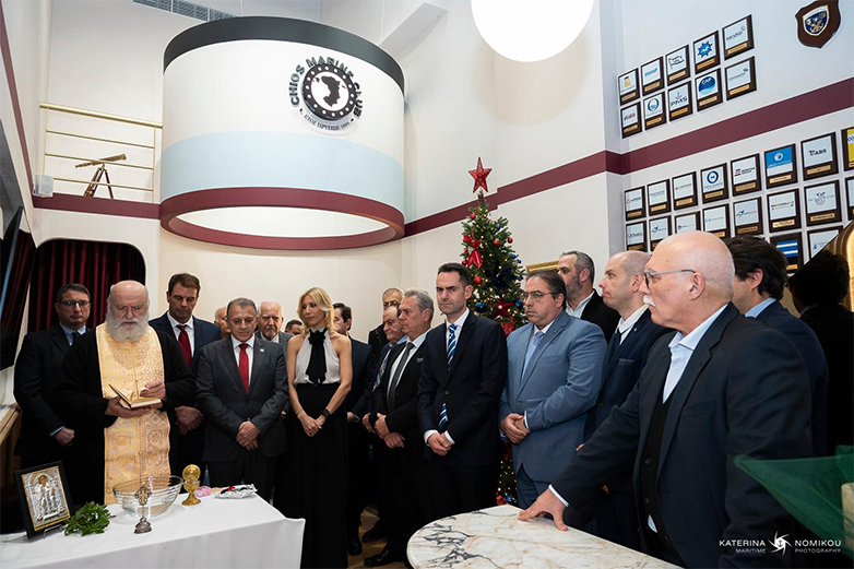 Στιγμιότυπο από τον αγιασμό των νέων γραφείων της Ναυτιλιακής Λέσχης Χίων