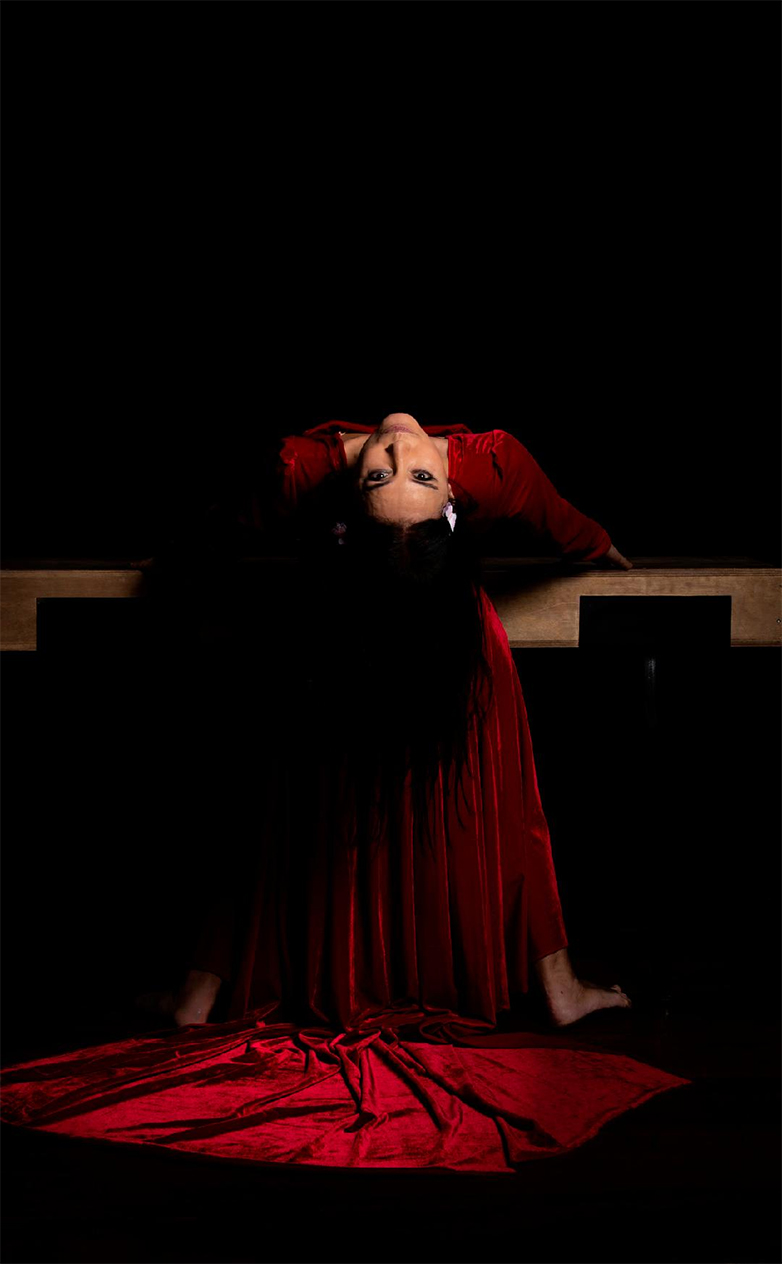 Η σαρωτική ερμηνεία της Ηρώς Μουκίου ακροβατεί στην κυριολεξία πάνω σε μια δοκό, υπό τους ήχους αρχαίας επτάχορδης λύρας, δια χειρός του σπουδαίου Νίκου Ξανθούλη επί σκηνής.