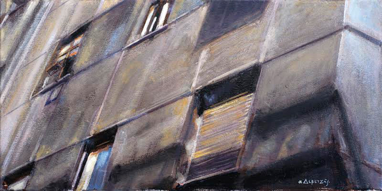 Η απεικόνιση της εμβληματικής «κυψέλης» του αθηναϊκού αστικού χώρου αποτελεί χαρακτηριστικό γνώρισμα της δουλειάς του Ανδρέα Δεβετζή τα τελευταία χρόνια. Από το 2008 κιόλας, τα κτίρια (δημιουργίες του μοντέρνου κινήματος, πολυκατοικίες του Μεσοπολέμου αλλά και μεταγενέστερες) άρχισαν να κεντρίζουν την προσοχή του κατά τους περιπάτους του στην καρδιά της πρωτεύουσας. Σαν αντανακλαστικό μνήμης στη φθορά του χρόνου και την απαξίωση της κρίσης, το πινέλο του φλέρταρε με τη μορφή τους αποτυπώνοντάς την με λάδια στον καμβά. «Τι με τράβηξε στις πολυκατοικίες; Η σάρκα τους», δηλώνει ο ίδιος. «Τις βλέπω σαν σώματα. Όπως το ανθρώπινο σώμα που φθείρεται, έτσι και τα κτίρια κουβαλούν στις προσόψεις τους όλο το βίωμα και την ιστορία τους».