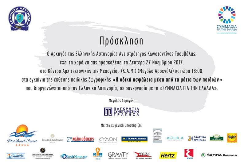 Ο Αρχηγός της Ελληνικής Αστυνομίας, αντιστράτηγος Κωνσταντίνος Τσουβάλας, έχει τη χαρά να σας προσκαλέσει τη Δευτέρα 27 Νοεμβρίου στο κέντρο Αρχιτεκτονικής της Μεσογείου (Κ.Α.Μ.) (Μεγάλο Αρσενάλι) και ώρα 18.00, στα εγκαίνια της έκθεσης παιδικής ζωγραφικής «Η οδική ασφάλεια μέσα από τα μάτια των παιδιών» που διοργανώνεται από την Ελληνική Αστυνομία, σε συνεργασία με τη «ΣΥΜΜΑΧΙΑ ΓΙΑ ΤΗΝ ΕΛΛΑΔΑ».