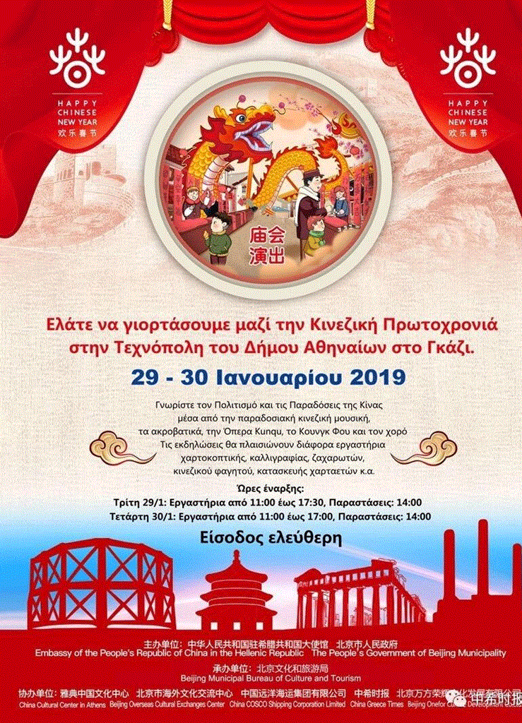 Την Κινεζική Πρωτοχρονιά θα γιορτάσει με πολιτιστικές εκδηλώσεις, στην Τεχνόπολη του Δήμου Αθηναίων στο Γκάζι, η Κινεζική πρεσβεία και η κινεζική κοινότητα στην Ελλάδα την ερχόμενη εβδομάδα στις 29 και 30 Ιανουαρίου.