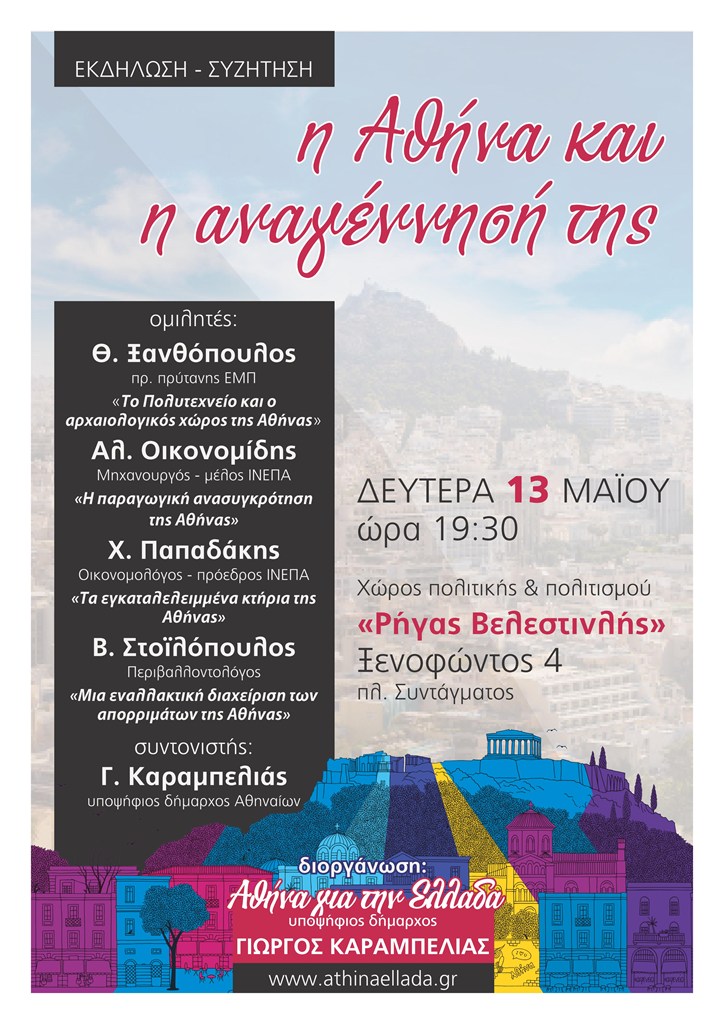 Ο δημοτικός συνδυασμός «Αθήνα για την Ελλάδα» οργανώνει την Δευτέρα 13 Μαΐου 2019 και ώρα 19:30 εκδήλωση με θέμα: