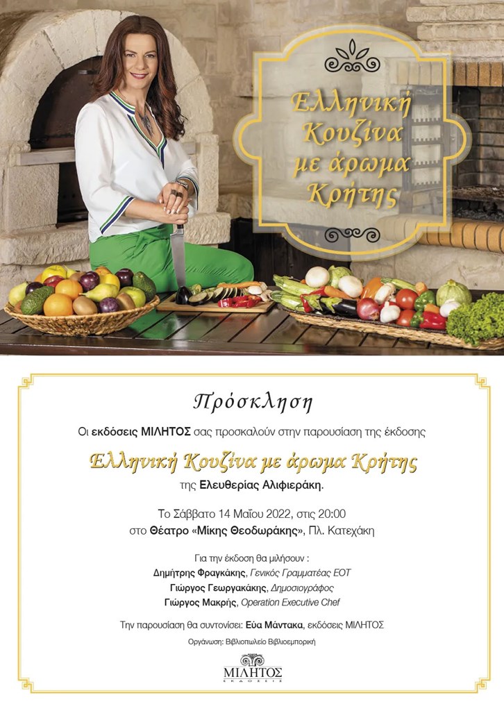 Η Ελευθερία Αλιφιεράκη, ένας πολυπράγμων άνθρωπος με ώθηση το μεγάλο πάθος της για τη μαγειρική, εμπνεύστηκε το βιβλίο «Ελληνική κουζίνα με άρωμα Κρήτης», το οποίο κυκλοφορεί από τις εκδόσεις Μίλητος.