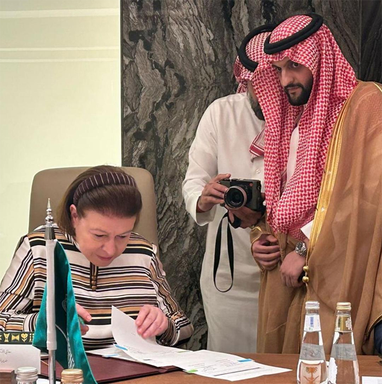 Η Λίνα Μενδώνη κατά την υπογραφή των πρακτικών της πρώτης συνεδρίασης της Πολιτιστικής Επιτροπής Ελλάδας – Σαουδικής Αραβίας