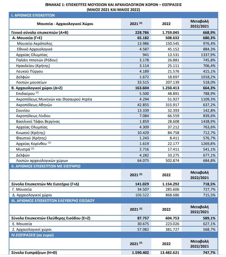 Αύξηση 680,3% καταγράφηκε στον αριθμό των επισκεπτών των μουσείων της χώρας τον Μάιο εφέτος, ενώ ο αριθμός των επισκεπτών ελεύθερης εισόδου αυξήθηκε 627,1% και των εισπράξεων 755,1%.