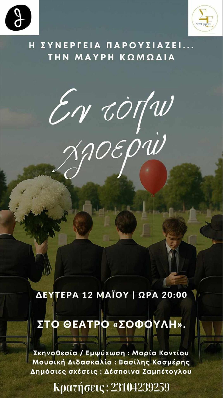 Η ΣυνΈργεια : Ομάδα Πολιτισμού παρουσιάζει τη μαύρη κωμωδία «Εν Τόπω Χλοερώ» στο Θέατρο Σοφούλη στις 12 Μαΐου 2025.