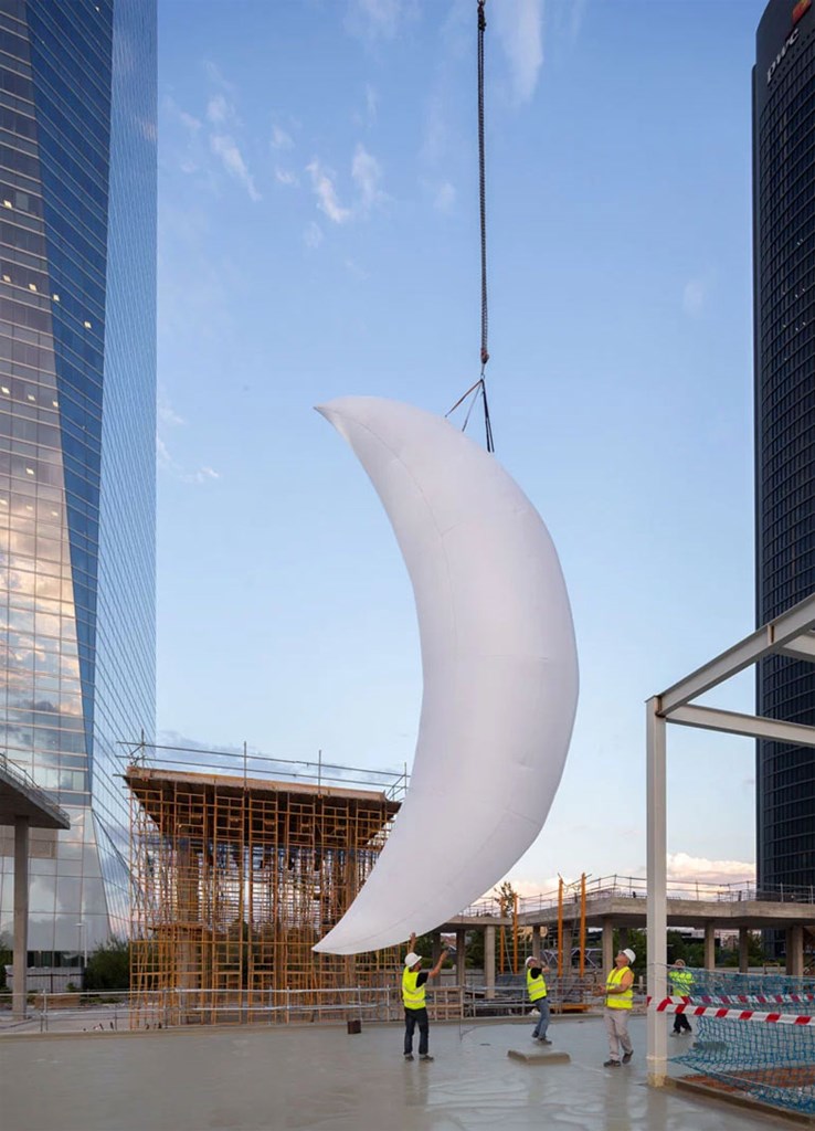 Το φωτεινό έργο, απλό και διακριτικό, είχε το σχήμα του γεμάτου κατά το ένα τέταρτο φεγγαριού, και αιωρείτο από γερανό δίπλα στο σύμπλεγμα Caleido στη βόρεια άκρη της Μαδρίτης.