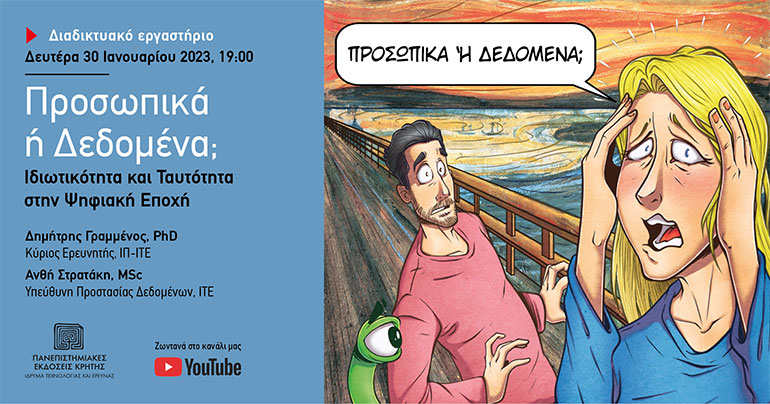 Με αφορμή την Παγκόσμια Ημέρα Προστασίας Προσωπικών Δεδομένων (28η Ιανουαρίου), ο Δημήτρης Γραμμένος και η Ανθή Στρατάκη, συγγραφείς του βραβευμένου κόμικ «Ο GDPR και οι 40 κλέφτες» που κυκλοφορεί από τις Πανεπιστημιακές Εκδόσεις Κρήτης, θα κάνουν ένα διαδικτυακό εργαστήριο που μιλά με κατανοητό και διασκεδαστικό τρόπο σχετικά με την Ιδιωτικότητα και την Ταυτότητα στην Ψηφιακή Εποχή.