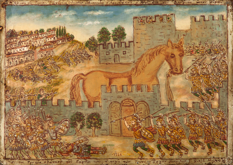 Ο Δούρειος ΄Ιππος του Θεόφιλου Χατζημιχαήλ (1871-1934), της περίφημης συλλογής Εμπειρίκου, μπορεί να χαρακτηριστεί ως ένας εθνικός θησαυρός και καλλιτεχνικό κόσμημα του μάγου περιηγητή της ελληνικής ιστορίας και μυθολογίας. Μέσα από το έργο αυτό ο ζωγράφος αποτυπώνει με μεγάλη λεπτομέρεια το μυθικό και ιδεατό κόσμο που ταξίδευε στην πλούσια φαντασία του από τα παιδικά του χρόνια.