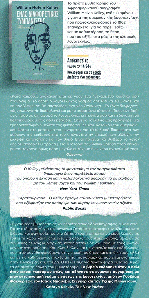Το πρώτο μυθιστόρημα του Αφροαμερικανού συγγραφέα William Melvin Kelley, ενός «χαμένου γίγαντα της αμερικανικής λογοτεχνίας», που πρωτοκυκλοφόρησε το 1962 και τον κατέταξε μεταξύ των James Baldwin και William Faulkner, επανέρχεται για να πάρει, έστω και με καθυστέρηση, τη θέση που του αξίζει στα ράφια της κλασικής λογοτεχνίας, από τις εκδόσεις «Μεταίχμιο».