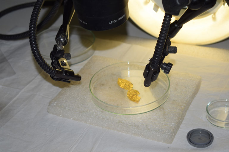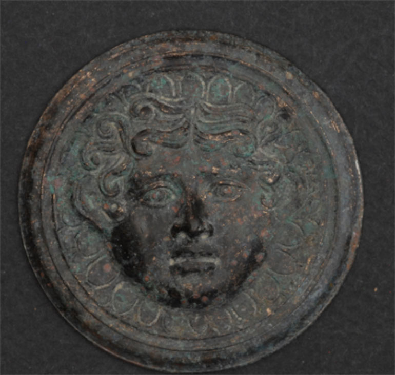 Η νεκρή γυναίκα έφερε στο στόμα της χρυσό έλασμα – πιθανόν επιστόμιο και δέκα διπλά χρυσά φύλλα δάφνης και ήταν ραμμένα – φέρουν και τις οπές -σε κάποιο υλικό είτε σε δέρμα είτε σε ύφασμα -ίσως κάποιο πέπλο-, είτε σε κάποιο στεφάνι που είχε στο κεφάλι. Στο δεξί της χέρι βρέθηκαν χρυσές κλωστές, σαν να είχε κάτι κεντημένο πάνω στο χέρι της. «Όλα αυτά φαίνονται να ήταν κάπου ραμμένα, ίσως στο ρούχο που φορούσε η νεκρή ή σε κάποιο ύφασμα με το οποίο την κάλυψαν», σημειώνει η κ. Χονδρογιάννη. Η γυναίκα είχε επίσης μια οστέινη βελόνη και μια λίθινη χάντρα και ήταν κτερισμένη με τέσσερα πήλινα μυροδοχεία, έναν πήλινο αμφορέα, ένα γυάλινο μυροδοχείο.