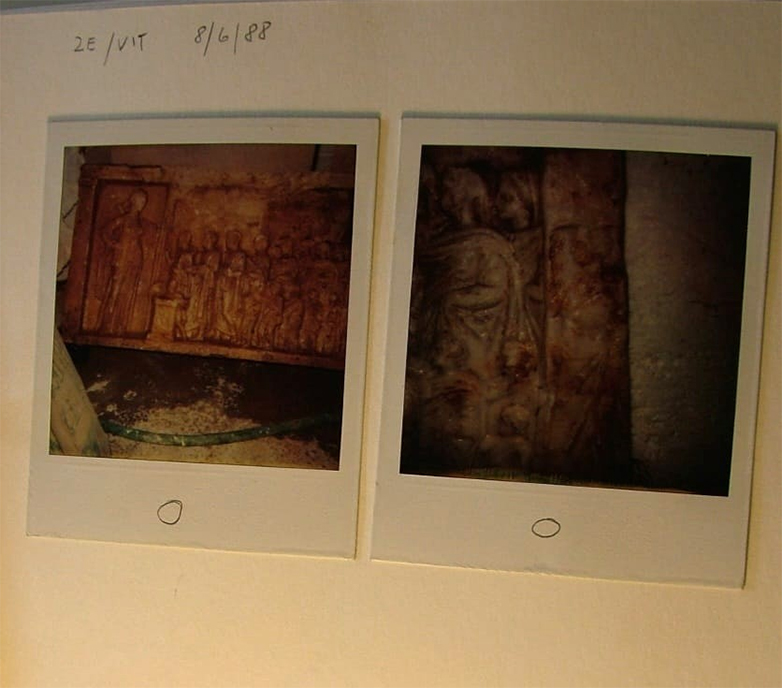 Σύμφωνα με την ανακοίνωση του ΥΠΠΟ, φωτογραφία του αναθηματικού αναγλύφου περιλαμβάνεται στο αρχείο του Gianfranco Becchina που κατασχέθηκε το 2002 στην γκαλερί του, στη Βασιλεία, έπειτα από κοινή επιχείρηση των ιταλικών και ελβετικών διωκτικών αρχών. Συγκεκριμένα, απεικονίζεται σε δύο polaroid φωτογραφίες (στη μία ολόκληρο, στη δεύτερη σε λεπτομέρεια). Πάνω από τις polaroid αναγράφεται η ημερομηνία 8/6/88 και τα αρχικά του Έλληνα διακινητή (ΖΕ/VIT). Το συγκεκριμένο αρχαίο αντικείμενο, σύμφωνα με τις ελληνικές δικαστικές Αρχές είναι προϊόν λαθρανασκαφής και διακινήθηκε παράνομα από την Ελλάδα.