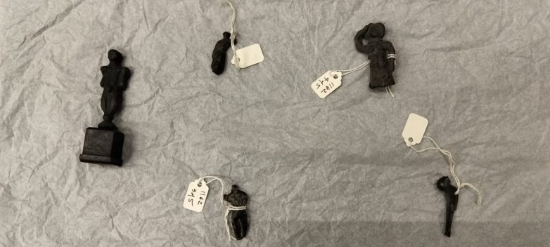 Τα χάλκινα ειδώλια, τρία ανδρικά και δύο γυναικεία, ύψους περίπου 6 εκ., ακολουθούν τον τύπο του λατρευτή με το ανασηκωμένο στην κεφαλή της δεξιάς χειρός, χαρακτηριστική χειρονομία της δέησης απέναντι στη θεότητα.