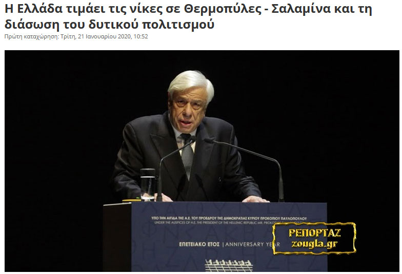Συνέχισε, αναφερόμενος στις δύο εμβληματικές μάχες: “Η αυτοθυσία και η μέχρις εσχάτων γενναιότητα των αγωνιστών των Θερμοπυλών τον Σεπτέμβριο του 480 π.Χ. (όταν 300 Σπαρτιάτες και 700 Θεσπιείς αναμετρήθηκαν με τουλάχιστον 300.000 στρατιώτες της περσικής αυτοκρατορίας) κατέστησε την ήττα τους μια απαράμιλλη ηθική νίκη, που η σημασία της και το παράδειγμά της μένουν βαθειά χαραγμένα στη παγκόσμια μνήμη. Όπως χαρακτηριστικά αναφέρεται στο επίγραμμα του Σιμωνίδη του Κείου: «Ω ξειν, αγγέλειν Λακεδαιμονίοις ότι τήδε κείμενα τοις κείνων ρήμασι πειθόμενοι», «Διαβάτη, μήνυμα να πας στους Λακεδαιμονίους: σ’ αυτήν εδώ τη γη πέσαμε και κειτόμαστε στον νόμο τους πιστοί».
