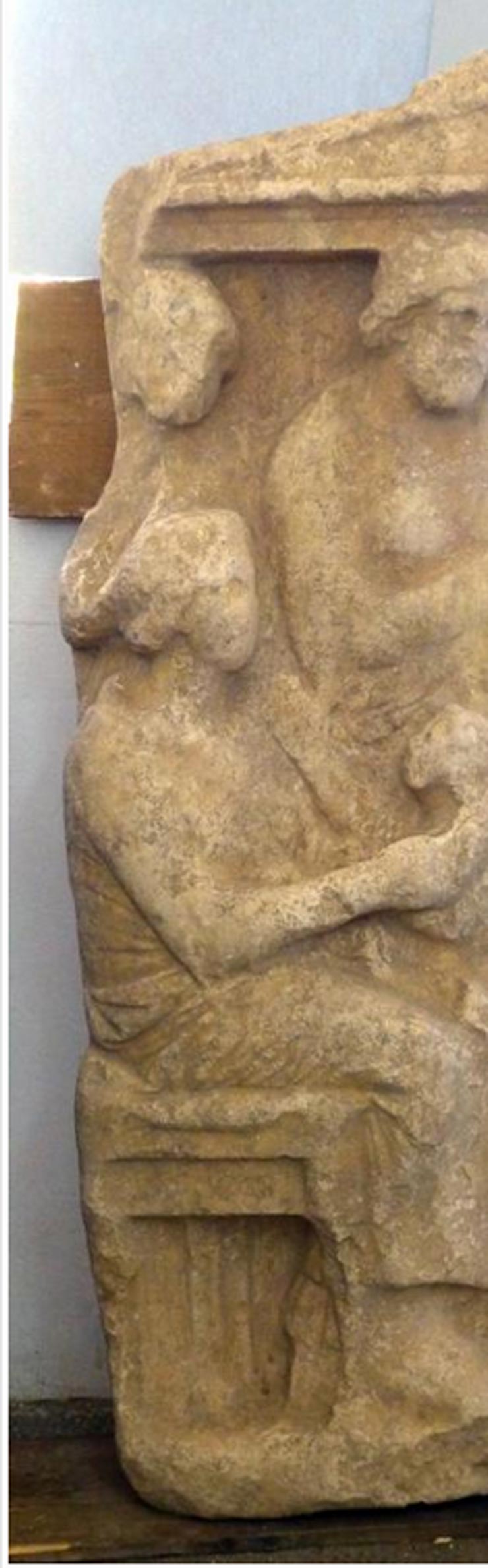 Σύμφωνα με δημοσίευση στην ιστοσελίδα του Ινστιτούτου (www.dainst.org), πρόκειται για τμήμα επιτύμβιας στήλης, που απεικονίζει ανάγλυφα σε πρώτο επίπεδο μια καθιστή γυναίκα και ένα κοριτσάκι και σε δεύτερο επίπεδο μια άλλη γυναίκα και έναν γενειοφόρο άνδρα. Οι μορφές βρίσκονται κάτω από ανάγλυφο επιστύλιο αετώματος, όπου υπάρχει δυσανάγνωστη επιγραφή, από την οποία ξεχωρίζει το όνομα «Δημόστρατος».