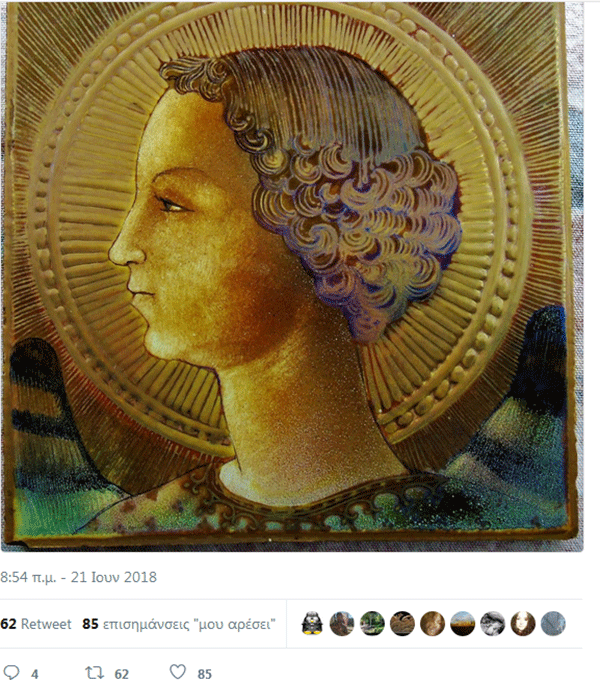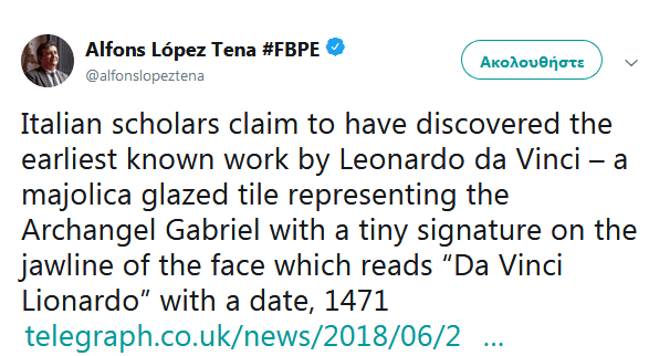 Οι ερευνητές είπαν ότι η υπέρυθρη ανάλυση του φιλοτεχνημένου σε κεραμικό έργου (διαστάσεων 20 επί 20 εκ.) αποκάλυψε μια μικρή υπογραφή στη σιαγόνα του προσώπου του αρχαγγέλου: «Da Vinci Lionardo» με χρονολογία, 1471.