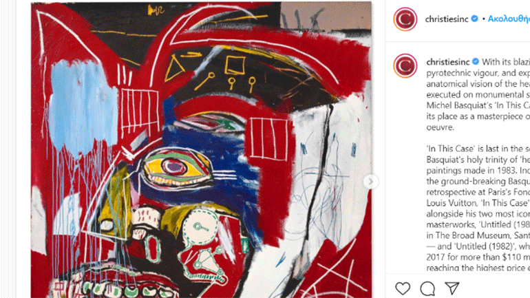 Ο οίκος δημοπρασιών Christie’s αποκάλυψε ότι ένα έργο του 1983 του Jean-Michel Basquiat θα δημοπρατηθεί στις 11 Μαΐου στη Νέα Υόρκη. Με τίτλο «In This Case», το έργο αναμένεται να πωληθεί αντί 50 εκατομμυρίων δολαρίων και προσφέρεται από τον Ιταλό συλλέκτη Giancarlo Giammetti, συνιδρυτή του οίκου μόδας Valentino.