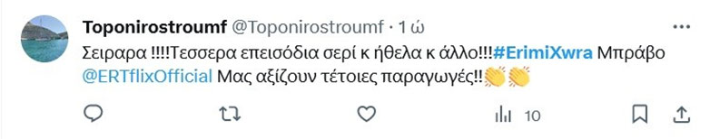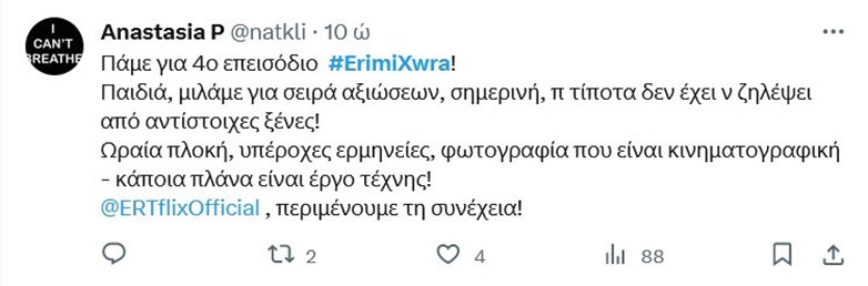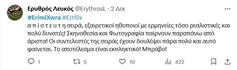 Αν και η σειρά βρίσκεται στο ERTFLIX μόλις λίγα 24ωρα, ήταν χιλιάδες εκείνοι που έσπευσαν να παρακολουθήσουν με αδημονία τα τέσσερα πρώτα επεισόδια (τα υπόλοιπα τέσσερα θα ανέβουν στις 15 Δεκεμβρίου) και με ιδιαίτερα εγκωμιαστικά σχόλια κατέγραψαν τις εντυπώσεις τους στα μέσα κοινωνικής δικτύωσης.