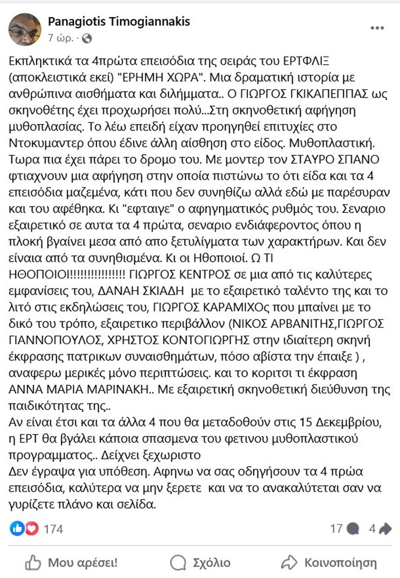 Διθυραμβικά ήταν τα σχόλια στα μέσα κοινωνικής δικτύωσης για τη νέα σειρά της ΕΡΤ «Έρημη χώρα» σε σκηνοθεσία και σενάριο του Γιώργου Γκιγκαπέππα, που από την 1η Δεκεμβρίου έχει «ανέβει» στο ERTFLIX.