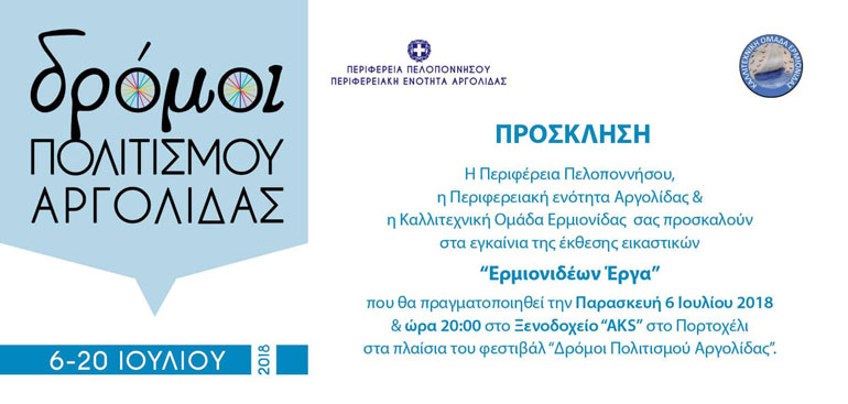 Έκθεση ζωγραφικής, αγιογραφίας, ξυλογλυπτικής, κοσμήματος και χειροτεχνίας από ερασιτέχνες δημιουργούς που ζουν και δραστηριοποιούνται στην Ερμιονίδα θα πραγματοποιηθεί στο πλαίσιο του Φεστιβάλ «Δρόμοι Πολιτισμού Αργολίδας».