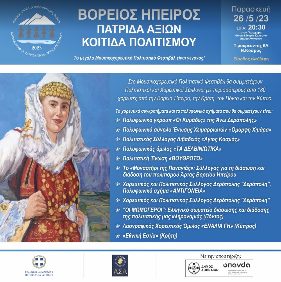 Το μεγάλο Μουσικοχορευτικό Πολιτιστικό Φεστιβάλ είναι γεγονός! Την Παρασκευή 26 Μάϊου 2023 στις 20:30 πραγματοποιείται η μεγάλη γιορτή του Βορειοηπειρωτικού Πολιτισμού στον Πολυχώρο «Άννα & Μαρία Καλουτά» στον Νέο Κόσμο (Τιμοκρέοντος 6Α, Ν.Κόσμος).
