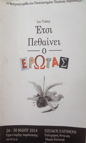 Η θεατρική ομάδα Πα.Πει. παρουσιάζει στον πολυχώρο Άννα και Μαρία Καλουτά, με ελεύθερη είσοδο, το έργο του Λέων Τολστόι ”Έτσι πεθαίνει ο έρωτας”. Για 5 παραστάσεις, 26-30 Μαϊου, ώρα 20:00.