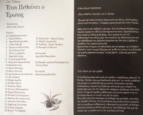 ”Ευτυχία δεν είναι να κάνεις πάντα αυτό που θέλεις, αλλά να θέλεις πάντα αυτ;o που κάνεις” , αναφέρει χαρακτηριστικά ο Λέων Τολστόι. Μέσα από το ”Έτσι πεθαίνει ο έρωτας”, ένα γλυκόπικρο διήγημα που ο Τολστόι έγραψε το 1853 και δεν δημοσίευσε ποτέ, παρακολουθούμε έναν νεαρό με άδολη, αγνή ψυχή, στην πορεία του από τον ενθουσιασμό της νιότης μέχρι την απώλεια της αθωότητάς του.