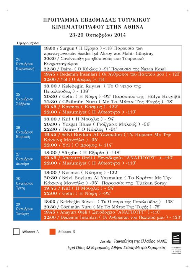 Με αφορμή τα 100 χρόνια Τουρκικού Κινηματογράφου, στον χώρο του ιστορικού κινηματογράφου της «Ταινιοθήκης» θα φιλοξενηθεί η «Εβδομάδα Τουρκικού Κινηματογράφου», από τις 23-29 Οκτωβρίου.