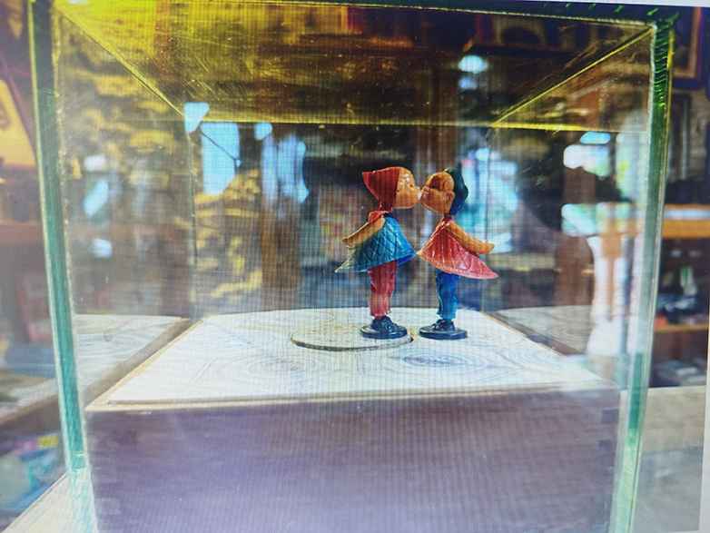 «Είναι ένα μικρό ζευγαράκι παιχνιδιών – αγόρι και κορίτσι – με ρούχα της εποχής. Είναι πλαστικά ανθρωπάκια, πάνω σε ένα ξύλινο κουτί που έχει έναν μηχανισμό ο οποίος περιστρέφει το κομμάτι που γυρίζει η μπαλαρίνα ενώ ο χορευτής είναι σταθερός . Έχουν και οι δυο μαγνήτη στο στόμα – πέρασαν χρόνια για να ανακαλύψουμε ότι χάρη σε αυτό ενώνουν τα στόματα τους και καταλήγουν στο φιλί – έμοιαζαν σα να κρατούν τον χρόνο ακίνητο», περιγράφει.