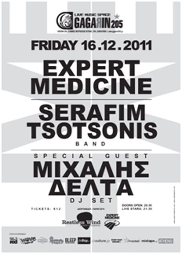 Την Παρασκευή 16 Δεκεμβρίου οι εκρηκτικοί Expert Medicine -για πολλούς «η καλύτερη live χορευτική μπάντα της χώρας»- ο Serafim Tsotsonis με το καταπληκτικό φετινό του album «Beautiful People» σε μια ιδιαίτερη και σπάνια full band εμφάνιση και ο πολύ σημαντικός μουσικός και παραγωγός Μιχάλης Δέλτα του οποίου το remix στο «Useless» των Expert Medicine κυκλοφορεί, συναντιούνται στο Gagarin 205 σε ένα μοναδικό party event.