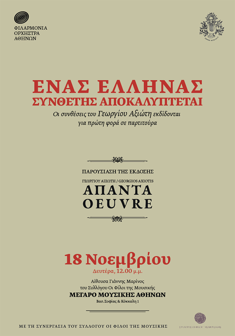 Εγκαινιάζοντας το εκδοτικό της πρόγραμμα, η Ορχήστρα παρουσιάζει την πρώτη εκδοτική της προσπάθεια, τη συνολική έκδοση των συνθέσεων ενός Έλληνα δημιουργού, του Γεωργίου Αξιώτη. Η έκδοση αυτή έχει μια ιδιαίτερη συμβολική σημασία διότι είναι η πρώτη στην ιστορία έκδοση του συνόλου του έργου ενός Έλληνα συνθέτη.