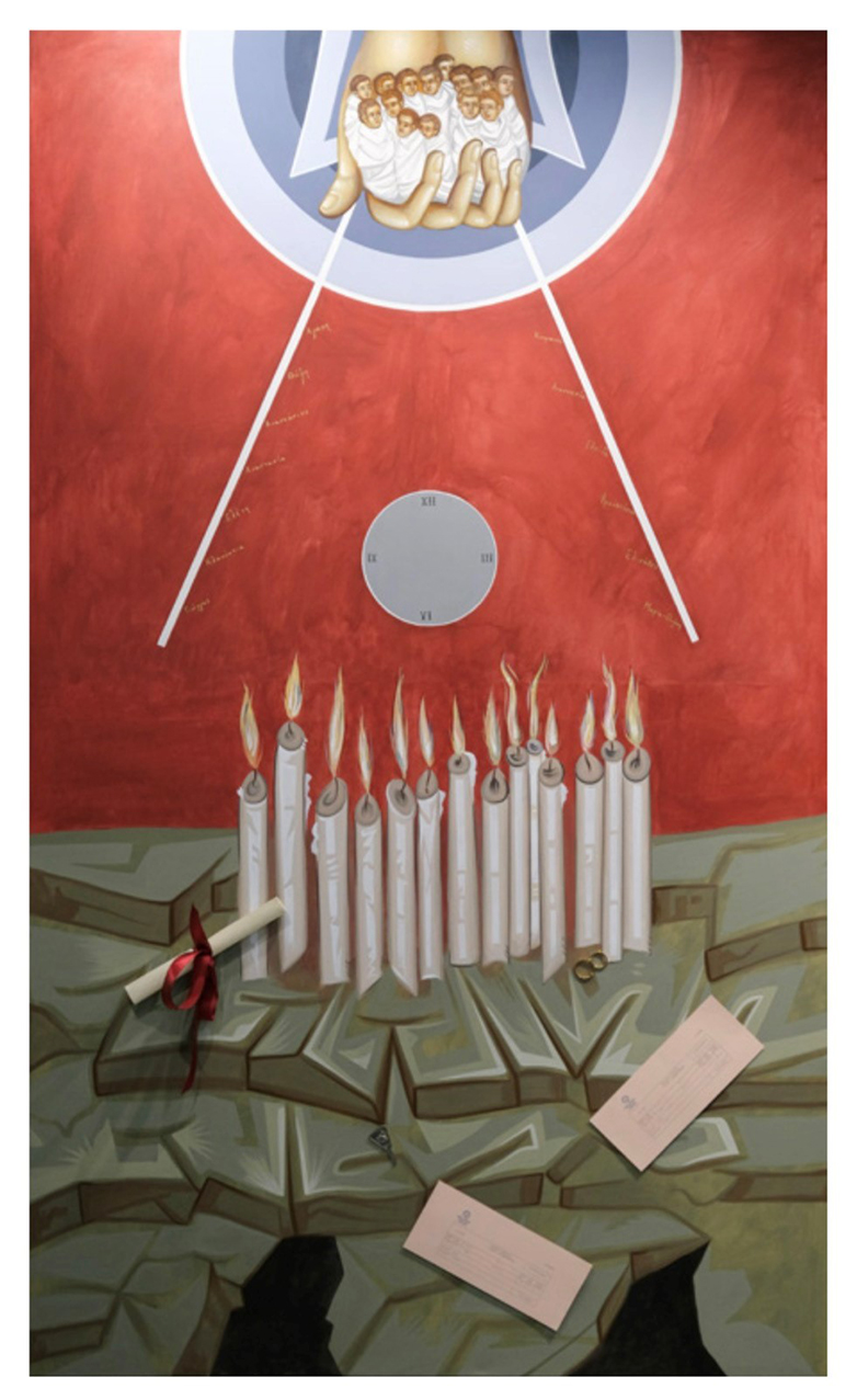 Ένα εισιτήριο τρένου με αναγραφόμενο προορισμό τη «Χώρα Ζώντων», δύο βέρες, ένα κλειδί, ένα ρολόι δίχως δείκτες -σύγχρονα αντικείμενα ενταγμένα σε ένα έργο βυζαντινής ζωγραφικής, σε έναν καμβά διαστάσεων 1,61×1 με ακρυλικά χρώματα, συνθέτουν μία εικόνα που εκπέμπει ένα μήνυμα παρηγορητικό και μία υπόσχεση μνήμης και προσευχής.
